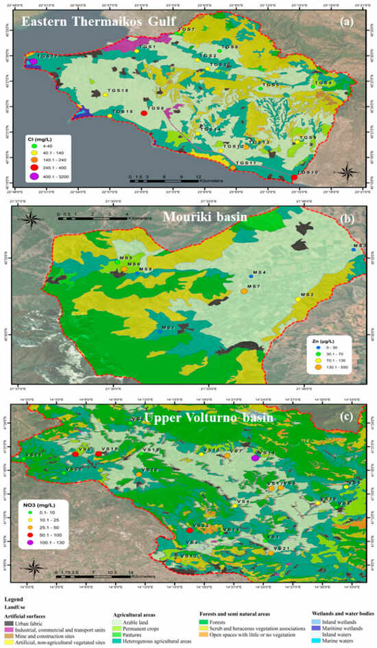 Distribution of Cl in the Eastern Thermaikos Gulf (a), Zn in the Mouriki basin (b), and NO3 in the Upper Volturno basin (c).