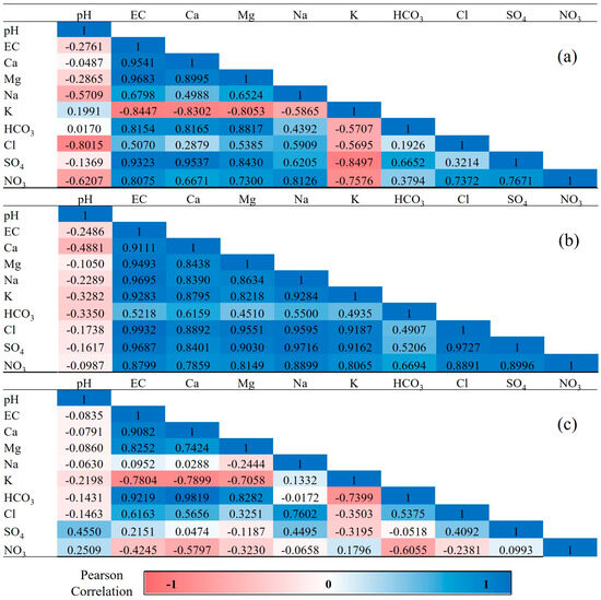 Correlation matrix of chemical parameters in groundwater samples of (a) Mouriki basin, (b) East Thermaikos Gulf, and (c) Upper Volturno basin.