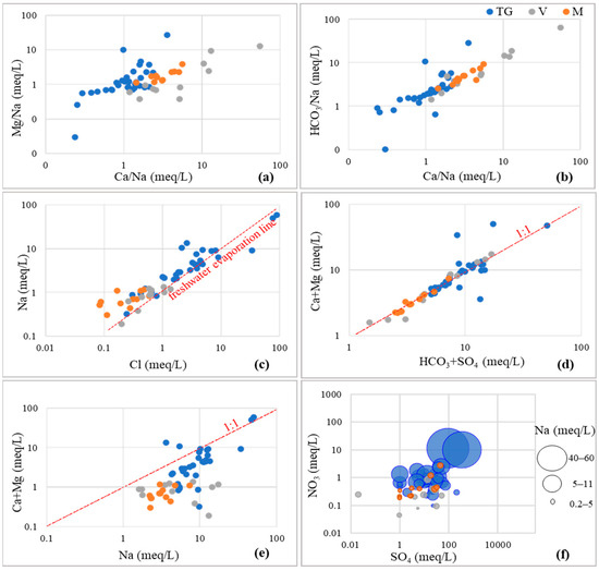 Ionic ratio plots relative to groundwater samples from M = Mouriki basin, TG = Eastern Thermaikos Gulf, and V = Upper Volturno basin: (a) (Mg/Na)/(Ca/Na), (b) (HCO3/Na)/(Ca/Na), (c) Na/Cl, (d) (Ca + Mg)/(HCO3 + SO4), (e) (Ca + Mg)/Na, and (f) NO3/SO4 with Na.