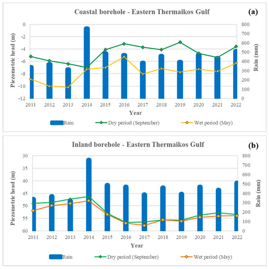 Long-period monitoring data of GWL measurements and rainfall data are provided in Figure 6 for TG. Wet and dry periods are separated to provide a clear view of the variations in each season over time. Two boreholes in the coastal (11 m above sea level) and inland (85 m above sea level) areas of TG were chosen to demonstrate the variations in the piezometric head from 2011 to 2022. The seasonal variation in the piezometric head in the coastal borehole is approximately 4 m during the wet and dry periods of the monitoring years (Figure 8a). On the other hand, minor GWL fluctuations are noted in the inland borehole (Figure 8b), where the over-pumping limits the increase in GWL. In addition, a significant decline in GWL is observed over time due to the over-pumping in the coastal/agricultural areas. In both cases, the variation in rainfall during the years affects the groundwater piezometry. In particular, the high values of 754 mm during 2014 contributed to the increase in the piezometric head.