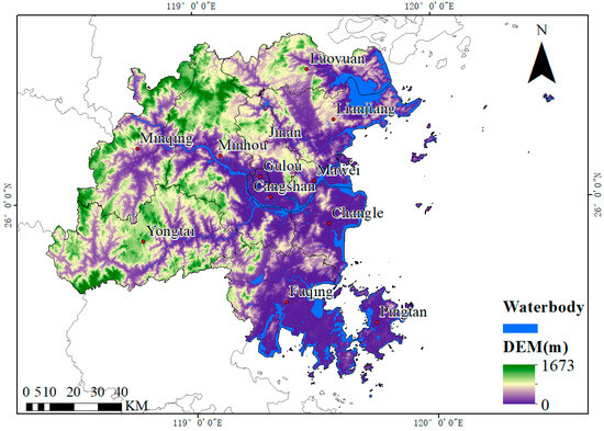 Fuzhou is located on the southeast coast of China, in the eastern part of Fujian Province, downstream of the Min River by the sea. The city has 13 counties and districts under its jurisdiction, as shown in Figure 1. As a typical representative of China’s eastern coastal cities, it is a disaster area which is greatly affected by typhoons and rainstorms nationwide. Fuzhou experiences many days of rainstorms and high-intensity rain. At the same time, with the accelerated progress of urbanization in Fuzhou, the proportion of impervious surface area is increasing, so that surface runoff is also increasing, and waterlogging disasters occur frequently.
