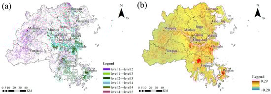 To further understand the characteristics of the changes in the vulnerability of Fuzhou, the types with a relatively large transformation area from 2014 to 2020 were screened and visualized, and changes in the vulnerability index of Fuzhou calculated, as shown in Figure 4. It can be seen that the transformation area is concentrated in the eastern coastal area and is characterized by mainly high vulnerability levels, while the vulnerability of the western area is mainly at Levels 1 and 2. These areas are mainly located in the urban area of Fuzhou close to the Minjiang River; according to the current trend, these areas are most likely to be transformed to Level 5 vulnerability in the future. Therefore, we need to focus on these areas when planning future disaster prevention and mitigation. The areas with greatest increases in their vulnerability index are mainly distributed in Fuqing City, Pingtan County, and Minhou County; of these, Fuqing City has experienced the greatest increase in its vulnerability index. The main reason is that Fuqing City has gradually improved its road network by means of intensified road construction in recent years. Changfu Expressway and the Binhai transport corridor were both constructed during this period, and the original national, provincial, and county roads were upgraded and reconstructed. The road network is now denser than it was in 2014, and this has driven the development of industry, the aggregation of population, and the promotion of economic development. However, the corresponding urban drainage facilities have not kept up with the construction, resulting in a sharp rise in the vulnerability index of the region. In the Level 5 vulnerable areas, which are mainly in the center of the study region, the vulnerability level has not changed, but the corresponding vulnerability index has decreased. This shows that the corresponding disaster reduction measures are effective and can reduce the vulnerability of urban waterlogging.