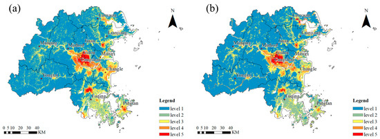 Accuracy check of Fuzhou waterlogging vulnerability prediction: (a) real waterlogging vulnerability in Fuzhou in 2020; (b) forecast waterlogging vulnerability in Fuzhou in 2020.