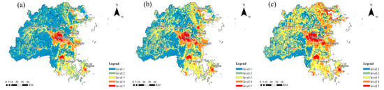 Assessment results of urban waterlogging vulnerability in Fuzhou: (a) 2014; (b) 2017; and (c) 2020.