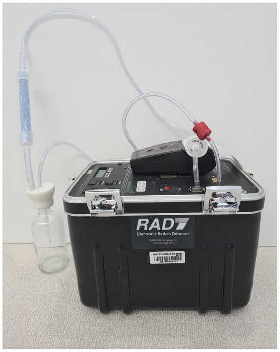 Radioactivity measurement instruments such as RAD7 (from Durridge, Billerica, MA, USA) with the RAD H2O accessory for radon measurements as well as gamma survey meters for gamma dose measurements (Geiger counter and scintillator detectors) were used in the present work. Figure 2 shows the RAD-7 used in the present work. The RAD7 H2O is an accessory to the RAD7 detector that enables the measurement of radon in water over a concentration range below 1 Bq/L. The range for RAD7 is 0.37 Bq/L to 14,800 Bq/L. The lower limit of detection is less than 0.3 Bq/L. The equipment is portable and battery operated. An accurate measurement of radon in water could be performed within an hour of taking the sample. The RAD H2O gives results after a 30 min analysis with a sensitivity that matches or exceeds that of liquid scintillation methods. During the five minutes of aeration, more than 95% of the available radon was removed from the water.