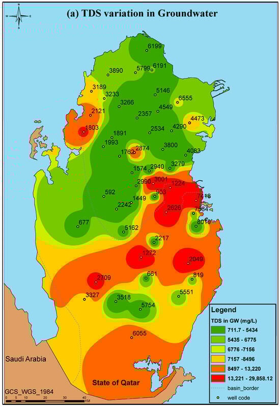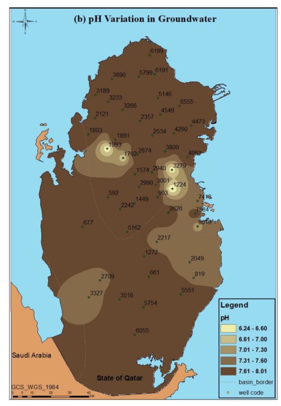 Spatial variations in TDS (a) and pH (b) in groundwater in Qatar.