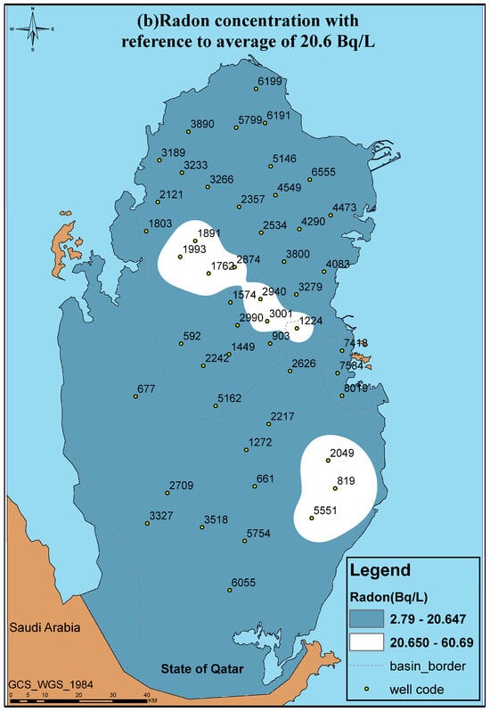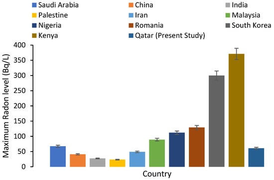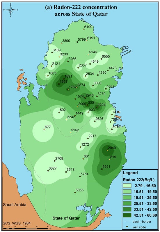 The monitoring of radon in groundwater around the world is well covered in the literature [,,,,,,,,,,,,,,,,,,,,,,,,]. The radon levels in groundwater wells vary from one place to another. Table 1 shows the radon levels in groundwater in various parts of the world. Rangaswamy [] investigated the radon level in the Shimoga district (India) and found the radon concentration to be between 3.10 ± 0.25 and 38.50 ± 1.54 Bq/L with a mean value of 13.60 ± 1.12 Bq/L. About 48% of the surveyed drinking water samples exceeded the US EPA’s maximum concentration level (MCL) of 11 Bq/L. Mehra [] analyzed the radon level in the groundwater, which is used for drinking, in Punjab (India). They found the radon level to be between 2 and 6.6 Bq/L. El-Sharkawy [] investigated the radon level in private groundwater wells in Tabouk and Al-Sharqiyah (Saudi Arabia) using RAD7 and found the range of the radon in the groundwater to be 5.5–11 Bq/L. As seen in Table 1, the radon levels in groundwater around the world showed some elevated levels that are above the EPA’s MCL; hence, the aim of the present work is to give an overview of the radon levels in groundwater and estimate their health effects. Moreover, reviewing the literature has not shown any previous reported work evaluating the radon levels in the groundwater wells across the map of Qatar. Furthermore, no radiological risk assessment which may occur as a result of the exposure to radon gas from groundwater in Qatar has been performed. Hence, the need to carry out this work is important for the country. Despite having few studies reporting the natural radioactivity in Qatari soil [,], to the best of our knowledge, there is no holistic study in the literature covering the variation in radon levels in the groundwater wells of Qatar and presenting a radiological risk assessment for exposure to radon. Given the fact that a significant part of the groundwater in Qatar is being used extensively for irrigation without any treatment, it would be beneficial to evaluate the radon levels in the groundwater wells of Qatar and investigate their radiological hazards.