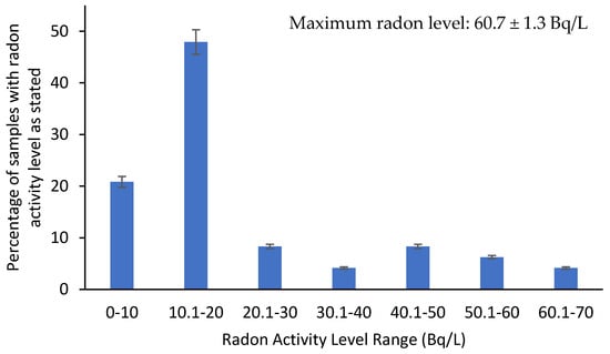 This accounts for 65% of the studied samples. According to the world health organization (WHO) [], water sources with radon levels above 100 Bq/L must be treated by means of aeration or an activated carbon system. In the present study, it was found that all of the studied samples had radon levels below the WHO action level.