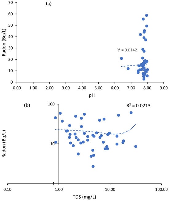 The correlation between the radon and the physicochemical characteristics of the groundwater were investigated by plotting the relationship between radon vs. pH and TDS for all the studied groundwater samples. Figure 7a,b shows the scattered data points which did not provide any conclusive correlation between radon and the physicochemical characteristics. This can be supported by observing the coefficients of determination (R2) for both plots, which were 0.067 and 0.094. The lack of correlation between radon and the physicochemical characteristics was well reported in the literature. For instance, Rahimi [] investigated the level of radon in groundwater in Iran and found that the level of radon is not correlated with the physicochemical characteristics. They reported the coefficient of determination to be as low as 0.005.