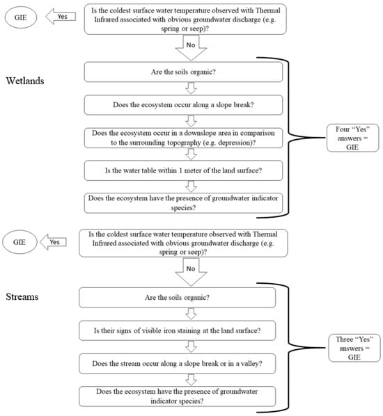 We conducted three types of on-site evaluations during June–August 2020–2022. In areas predicted to be suitable for GIEs in or around NWI-mapped wetlands, we used a site rapid assessment composed of questions (Figure 2) and measurements to assess vegetation, topography, soils, and presence of water features characteristic of wetland GIEs [,,,]. At sites in areas predicted to be suitable for GIEs near a stream or river, the rapid assessment included questions modified for rivers and streams (Figure 2). Our rapid assessments were guided by previously developed assessments (e.g., U.S. Forest Service Gen. Tech. Report WO-86a) and in consultation with professional wetland ecologists and hydrogeologists. We inferred a high likelihood of suitable conditions for GIE “presence” at locations in our validation dataset where at least four of six rapid assessment questions were answered affirmatively. In addition to the rapid assessment survey, we measured water surface temperature at the sites with a handheld infrared (IR) camera (Forward Looking InfraRed (FLIR) E6, Teledyne FLIR LLC; [,]. We used the IR camera to scan wetland (e.g., out 25 m from initial XY location in each cardinal direction), streams, and river edges at the site (e.g., out from the initial XY location to extent of predicted suitable area up and down stream or river) to locate where cold water (≤12 °C) contrasted with background temperatures (≥18 °C), indicating groundwater discharge. If our IR camera detected these temperature anomalies (Supplementary Materials, Figure S1), we considered the site to be a “presence” location in our validation dataset.