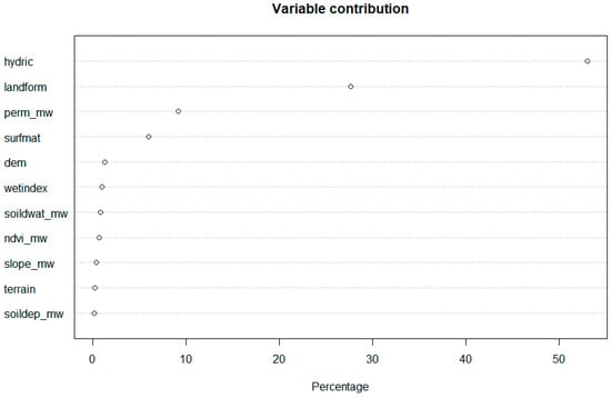 Mixed Wood Plains EPA Level II Ecoregion Maxent model variable importance plot showing percentage contribution of each environmental variable to the overall fit of the model. The greater the percent, the greater the contribution of the variable to the overall fit of the model. hydric = hydric soil, surfmat = surface materials, perm_mw = soil permeability, soildwat_mw = soil water holding capacity, landform = landforms, dem = elevation, wetindex = topographic wetness index (TWI), terrain = terrain roughness index, slope_mw = slope, soildep_mw = soil depth, ndvi_mw = Normalized Difference Vegetation Index.