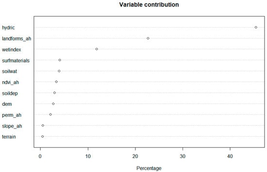 Atlantic Highlands EPA Level II Ecoregion Maxent model variable importance plot showing percentage contribution of each environmental variable to the overall fit of the model. The greater the percent, the greater the contribution of the variable to the overall fit of the model. hydric = hydric soil, soilwat = soil water holding capacity, wetindex = topographic wetness index, dem = elevation, terrain = terrain roughness index, perm_ah = soil permeability, surfmaterials = surface materials, landforms_ah = landforms, slope_ah = slope, soildep = soil depth, ndvi_ah = Normalized Difference Vegetation Index.