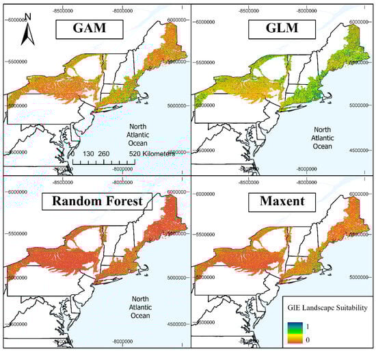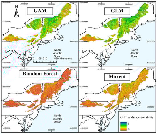 No single modeling approach will fit every scenario [], and using only one approach may bias results [,,]. Therefore, we modeled landscape suitability for GIEs in our study areas with four correlative distribution modeling approaches. We developed two classical regression models (Generalized Additive Models, or GAMs; Generalized Linear Models, or GLMs) and two machine learning models (Maximum Entropy, or MaxEnt; Random Forest) that are extensively used in species distribution modeling [,]. Generalized Additive and Linear Models have commonly been used as correlative distribution modeling methods [,,]. These models have an established statistical foundation for understanding ecological relationships, with GLMs fitting linear terms to parametric distributions and with GAMs smoothing data to fit terms in non-linear functions with non-parametric distributions. MaxEnt [] is a machine learning algorithm that estimates distributions by finding the distribution with maximum entropy given the environmental conditions at occurrence locations. MaxEnt is a correlative distribution modeling method that performs well when compared with similar methods [,]. Random Forest [] is a modification of classification and regression trees that ensembles decision trees to make predictions. Like MaxEnt, Random Forest has also performed well when compared against similar methods []. We averaged the predictions from these four models to create one consensus or ensemble model for each ecoregion.