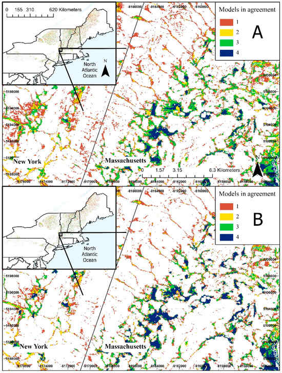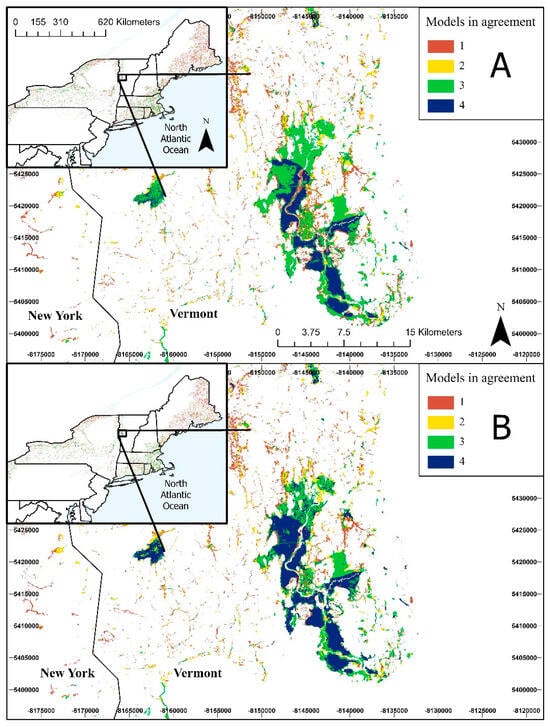 Areas in the Atlantic Highlands EPA Level II Ecoregion where suitable conditions are predicted for groundwater-influenced ecosystem occurrence ((A) 0.70 threshold; (B) Natural Breaks). Values indicate the number of models in agreement (e.g., 2 = 2 models in agreement). The models in agreement with each pixel are presented in Supplementary Materials, Figure S2.