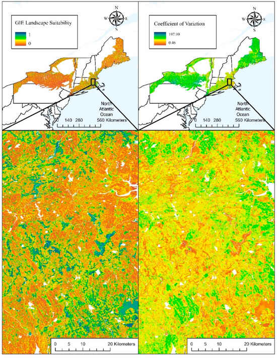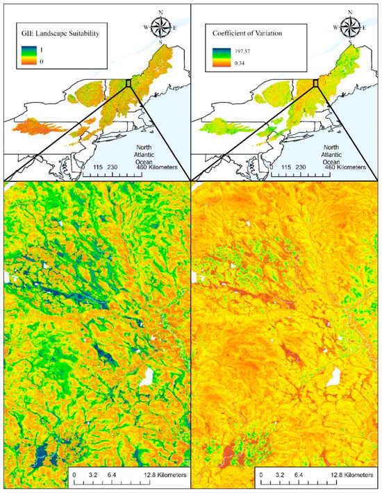 Ensembled model predicted suitability for groundwater-influenced ecosystem occurrence (top left frame) and coefficient of variation between the four model predictions in the Atlantic Highlands EPA Level II Ecoregion. Bottom left and right frames correspond to the same geographic areas that had high predicted landscape suitability for GIEs and also had low coefficient of variation values. White areas in the lower frames indicate open water.