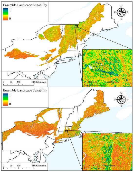 We observed geographic trends in model agreement. For example, in the Atlantic Highlands Ecoregion, the largest clusters of suitable (top 10th percentile) areas in the ensemble model occurred in northern Vermont and New Hampshire. There was also the least amount of variability among model predictions (coefficient of variation < 25; Figure 10; Supplementary Materials, Figure S4) in this region. In the Mixed Wood Plain ecoregion, clusters of predicted suitable area (suitability in the upper 10th percentile) occurred where there was the most certainty among model predictions (i.e., smallest coefficient of variation) based on the coefficient of variation for each pixel (coefficient of variation value < 25; Figure 11; Supplementary Materials, Figure S5).