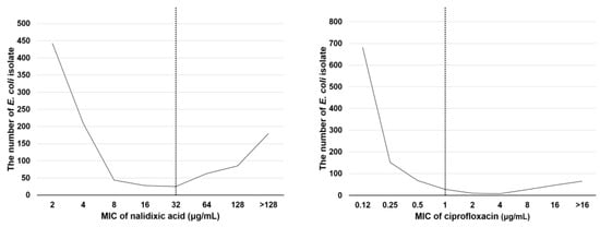 The phenotypic profiles of the E. coli isolates were determined using the microdilution method. Broth microdilutions are typically used to test antimicrobial susceptibility. Bacterial suspensions adjusted to 0.5 McFarland scale were inoculated onto a 96-well microtitration plate (KRNV5F, Daejeon, Republic of Korea) that was commercialized in the livestock sector with 16 antimicrobial agents. After incubation for 1 day at 35 °C, the minimum inhibitory concentration (MIC) was checked with the naked eye or an automated reader, which facilitates reading microdilution tests and recording results with a high ability to discern growth in the wells. For the determination of MIC endpoint, the breakpoints of 16 antimicrobial agents in the panel were set in accordance with the guidelines of the Clinical Laboratory Standard Institute [13] and European Committee on Antimicrobial Susceptibility Testing [14]. The KRNV5F panel has a MIC test range of 2–128 μg/mL for nalidixic acid and 0.12–16 μg/mL for ciprofloxacin. The MIC breakpoints of nalidixic acid and ciprofloxacin were 32 and 1 μg/mL, respectively. The distribution curve was obtained by plotting the number of isolates against the quinolone concentration.