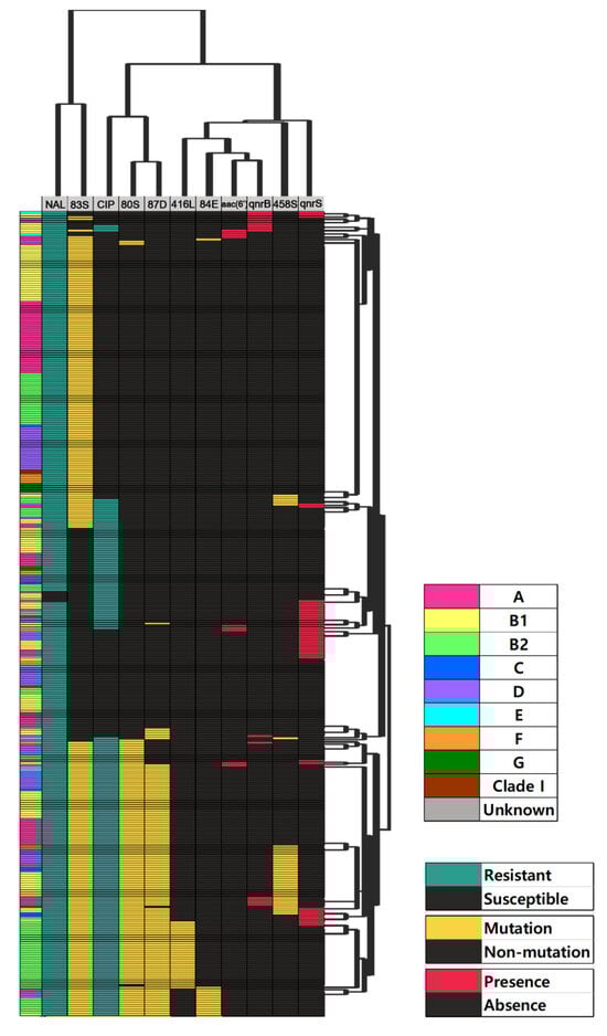 Groups A, B1, and D showed similar proportions of isolates harboring PMQR genes and/or QRDR mutations, but more than 90% isolates from group B2 acquired quinolone resistance due to QRDR mutations (Figure 3b). In particular, qnrS, qnrB, and acc(6′)-Ib-cr were widely distributed in groups A and B1 (Figure 3c). In the QRDR analysis, mutations in gyrA (codons 83 and 87) and parC (codon 80) were distributed evenly among the phylogenetic groups (A, B1, B2, and D), while mutations in parE (codon 458) mainly occurred in group B1 and mutations in parE (codon 416) occurred only in group B2 (Figure 3d).