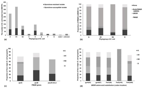 Analysis of the resistance acquisition (PMQR, QRDR) for the four major phylogenetic groups confirmed significant differences between the groups (p < 0.05). Although isolates harboring PMQR genes were associated with groups A and B1, isolates with QRDR mutations were significantly associated with group B2 (Figure 3b,c).