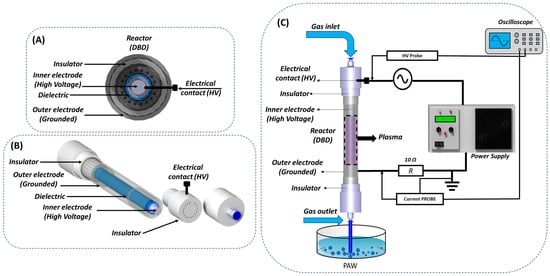 (A) Front view of components of the coaxial DBD reactor, (B) perspective view of the coaxial DBD reactor and its respective components, and (C) schematic representation of the coaxial DBD reactor and its electrical monitoring setup [].