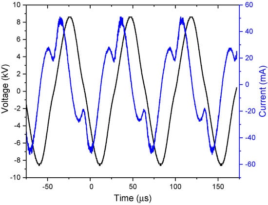The voltage–current waveform of DBD air plasma is shown in Figure 2. The observed peak-to-peak voltage was 17.2 kV and the peak-to-peak current was 102 mA.