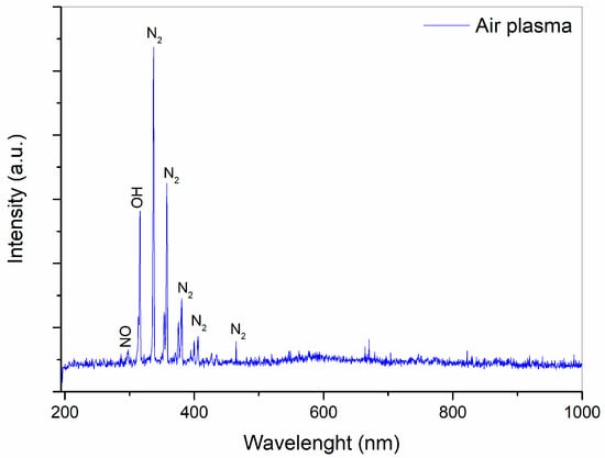 The emission spectra of DBD in air are shown in Figure 3. A low-intensity peak at 296 nm is visible in the spectra, attributed to NO []. The band at 317 nm corresponds to OH emission []. Emission lines located between 330 and 406 nm are associated with the N2 s positive transition (C3Π → B3Π) []. A similar spectrum was previously recorded during air discharge by DBD plasma []. The OES results indicate the presence of nitrogen, NOx, and OH species. In a study by Zhou et al. [], it was demonstrated that the formation of RONS in water was primarily due to the reactivity of the plasma. Based on this analysis, it is possible that in the current study, the negative and positive ions reacting with water molecules could result in changes to the physicochemical properties of the water.