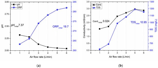 Variation in (a) pH and ORP, and (b) conductivity and TDS, in relation to varying air flow rates after 10 min of plasma activation.