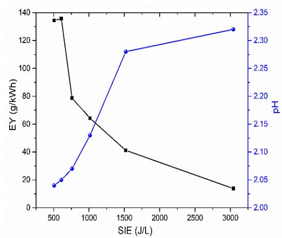In DBD plasma studies, the specific input energy (SIE) is commonly used to evaluate the power-to-gas-flow-rate ratio []. DBD systems are known for their effectiveness in ozone production and, when operated with atmospheric air flow, for generating NOx species []. The efficiency yield (EY) serves as a parameter to measure ozone generation efficiency. It is defined as the ratio of the ozone concentration produced during discharges to the SIE []. Figure 5 displays the EY (and pH) in relation to the SIE, using data from Figure 3. An ozone meter (V-106 H, 2B Technologies, Broomfield, CO, USA) situated at the DBD exhaust measured the ozone concentration. The findings indicate that a superior EY is linked to a reduced SIE, suggesting a more significant air flow. Consistent with this, Yuan et al. [] observed that for DBD systems operated in air, the concentration of NO2 peaks at a lower SIE value. Primary reactions involve the oxidation of NO by oxygen atoms, represented by the reaction NO + O + M → NO2 + M and by ozone NO + O3 → NO2 + O2 []. However, Jogi et al. [] noted that when the SIE exceeds 400 J/L, a modest decrease in NO2 concentration is evident. This reduction is attributed to the reaction NO2 + O → NO + O2, which becomes more prevalent at higher SIEs, thereby limiting the accumulation of NO2 []. Understanding that water acidification through plasma-derived species predominantly engages reactive nitrogen species, this analysis aptly supports the detected pH decrease with declining SIE (or augmented air flow).