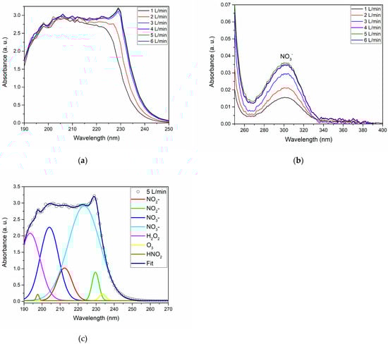 Figure 6a,b showcase the deep and near-UV absorption spectra of PAW, highlighting the pronounced impact of varying gas flow rates. The identification of reactive species such NO2−, NO3−, H2O2, O3, and HNO2 was achieved through the deconvolution of the deep UV absorption spectra, depicted in Figure 6c. These species arise from diverse reaction pathways, including both transient and persistent reactive species generated in the plasma phase [,]. A distinct peak around 300 nm in Figure 6b solidifies the consistent presence of NO3− across various gas flow rates [].