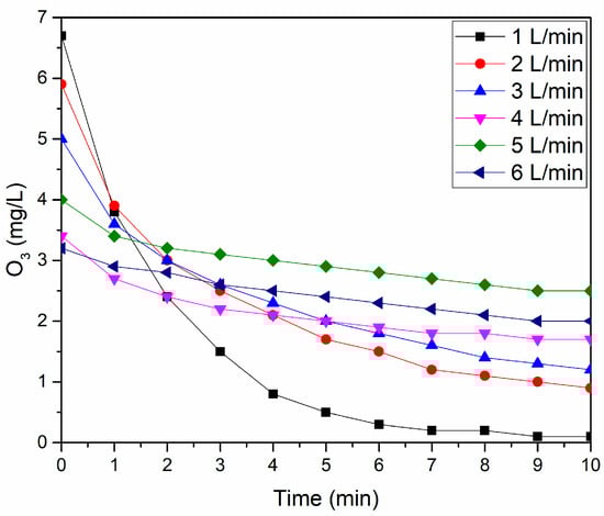 The gas phase measurement of O3 was performed by coupling the Ozone Analyzer—High Range—UV-106H (2B Technologies, Broomfield, CO, USA) to the gas outlet of the reactor, varying all the studied gas flows and with a measurement interval between 0 and 10 min.