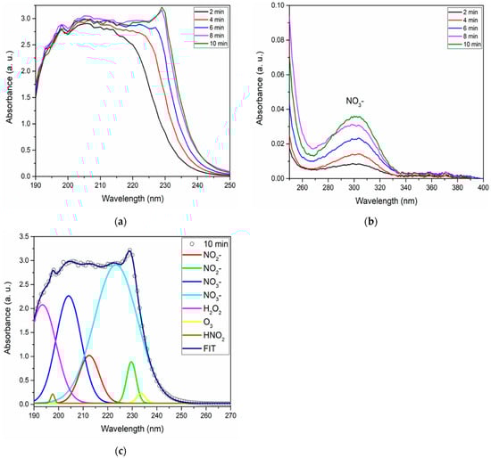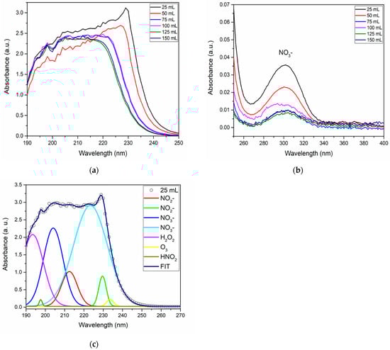 Figure 11a shows the spectra corresponding to the activation volumes studied for the deep UV absorption region. The NO3− is maintained, as Figure 11b shows near-UV absorption [,]. For this test, a higher intensity was observed for the PAW volume of 25 mL. The deconvolution (Figure 11c) of deep UV spectra was performed to identify the presence of NO2−, NO3, H2O2, HNO2, and O3. The quantification of NO2−, NO3−, H2O2, and HNO2 concentrations were made and are presented in Table 3.