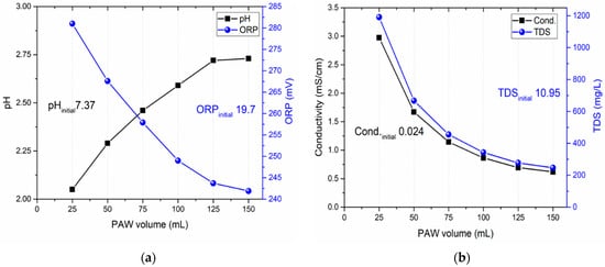 Effects on (a) pH and ORP and (b) conductivity and TDS at varying activation volumes. The values were obtained after 10 min plasma activation.