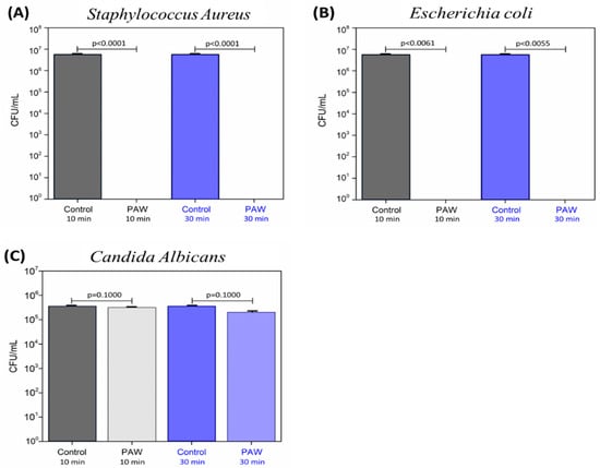 Number of viable cells after exposure to Plasma-Activated Water (pH 2.05) after 10 and 30 min, where: (A) Staphylococcus aureus ATCC 6538 (CFU/mL), (B) Escherichia coli ATCC 10799 (CFU/mL), and (C) Candida albicans SC 5314 (CFU/mL). Control: non-activated deionized water (negative control).