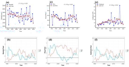 Annual variations, and Mann–Kendall test of rainfall (a,b), flow discharge (c,d), and sediment load (e,f).
