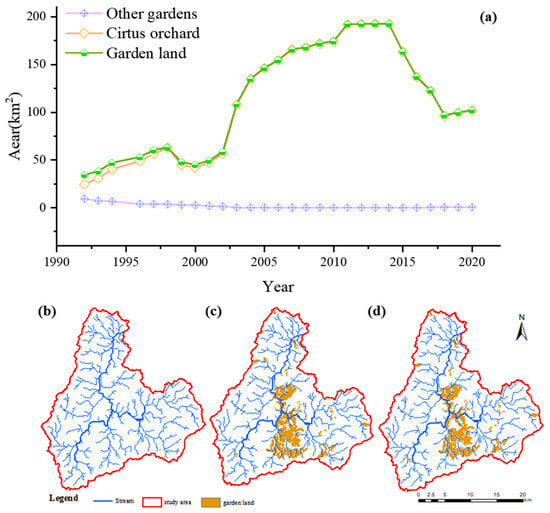 The area of garden land in Anyuan country, from 1992 to 2020 (a), Spatial distribution of garden land in the upper Lianjiang River watershed ((b): 1990, (c): 2010, and (d): 2020).