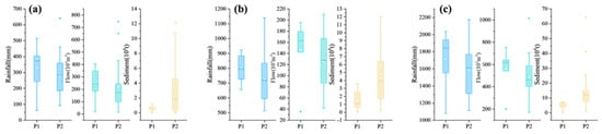 Distribution characteristics of extreme rainfall (a), ordinary rainfall (b), total rainfall (c), and their corresponding riverine flow discharge and sediment load for different periods. Solid lines and square in this figure represent the median and mean, respectively. The box boundaries represent the 75% and 25% quartiles; the whisker caps represent the 90% and 10% quartiles; and the circles represent the 95% and 5% quartiles.