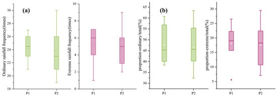The frequency (a) and proportion (b) distribution of ordinary and extreme rainfall in different periods. Solid lines and square in this figure represent the median and mean, respectively. The box boundaries represent the 75% and 25% quartiles; the whisker caps represent the 90% and 10% quartiles; and the circles represent the 95% and 5% quartiles.