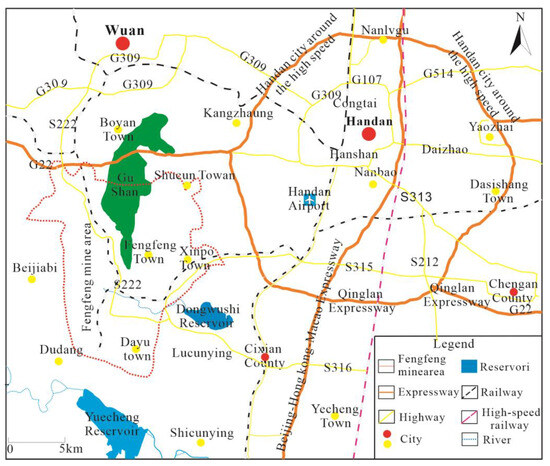 The Fengfeng mining area belongs to Handan City, Hebei Province, located in the south of Hebei Province, at the junction of Shanxi, Hebei and Henan provinces, at the eastern foot of Taihang Mountain and on the west side of North China Plain. Its geographical coordinates are 36°20′–36°34′ north latitude and 114°3′–114°16′ east longitude, as shown in Figure 1.