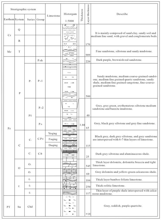 The main lithology of the Ordovician limestone aquifer is gray pure limestone, dolomite, and dolomitic limestone, with a thickness of 500–600 m. In the third member (O2x3) of the Lower Majiagou Formation in the Middle Ordovician, there are 5–6 layers of rock salt or gypsum pseudocrystals, with each layer thickness of 0.15–0.20 m. Due to the uneven development of karst in Ordovician limestone, karst development and water-rich characteristics are controlled horizontally by folds, faults, and tensile fracture structures. Different lithological combinations in the vertical direction have different degrees of karst, and the aquifer can be divided into three groups and eight sections.
