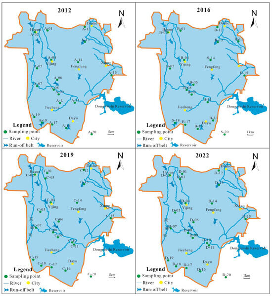 This study collected 18 karst hydrochemical data from the Fengfeng mining area in 2012 and 18 karst hydrochemical data from 2016; 20 samples of karst groundwater were collected in 2019 and 2022, and the distribution map of water sample points is shown in Figure 5.