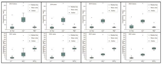 Total dissolved solids (TDS) are used to evaluate the total salt content in water. In 2012, the TDS range of karst water in the study area was 321.6–1482.3 mg/L, with freshwater (TDS < 1 g/L) accounting for 89.5% and brackish water (1 g/L ≤ TDS < 3 g/L) accounting for 10.5%. The TDS range of karst water in the study area in 2016 was 250.3~1461.6 mg/L, with freshwater accounting for 94.4% and brackish water accounting for 5.6%. The TDS range of karst water in the research area in 2022 is 325.2~1511.1 mg/L, with freshwater accounting for 95.0% and brackish water accounting for 5.0%. According to the average concentration of each ion, combined with Figure 6, it can be seen that in different years, Ca2+ > K + +Na+ > Mg2+, HCO3− > SO42− > Cl−. Therefore, the cations in the karst groundwater in the study area are mainly Ca2+, while the anions are mainly HCO3− and SO42− (Table 1).