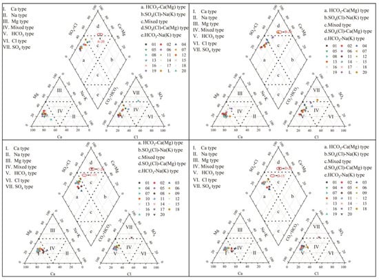 From a spatial analysis, the hydrochemical type of the eastern region (point 20) is different from other regions. Cations are still mainly Ca2+ and Mg2+, while anions are mainly SO42− and Cl−. The hydrochemical type has evolved into SO4(Cl)-Ca(Mg) type. From a time perspective, due to changes in hydrological processes, the hydrochemical types change every year, but this change is minimal.