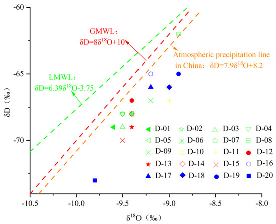 Due to the lack of isotope monitoring stations for observing atmospheric precipitation in the study area, the precipitation line equation of Shijiazhuang, which is approximately 200 km away from the Fengfeng mining area, was used as the approximate regional atmospheric precipitation line equation for the study area. The equation is: