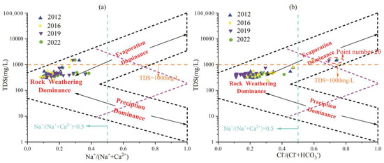 Gibbs diagram of karst groundwater in the Fengfeng mining area each year. (a) TDS vs. Na+/(Na+ + Ca2+) relationship, (b) TDS vs. Cl−/(Cl− + HCO3−) relationship.