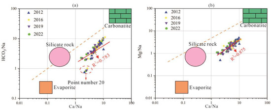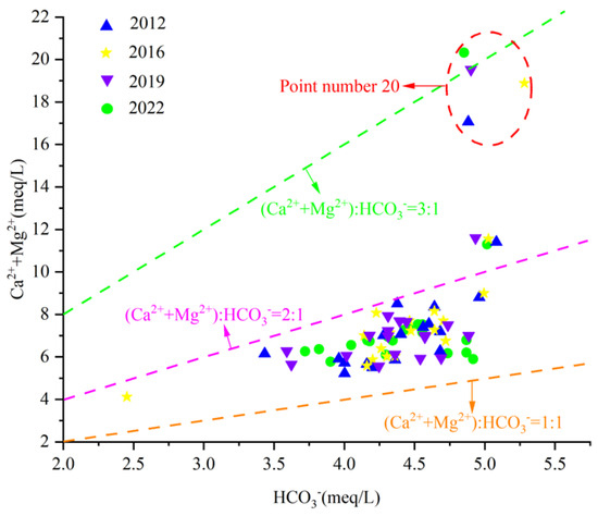 In addition to carbonate karst erosion, the dissolution of silicic rock minerals also increases the plasma concentrations of Ca2+, Mg2+, and HCO3− in water. Therefore, the(Ca2+ + Mg2+)/HCO3− milligram equivalent scatter plot can preliminarily determine the source of Ca2+ and Mg2+ in groundwater. If Ca2+ and Mg2+ in groundwater only come from carbonate dissolution or weathering of silicic rock minerals, the ratio of γ(Ca2+ + Mg2+)/HCO3− is close to 1/2. That is, the groundwater sample point falls near line 1:2, which indicates that Ca2+, Mg2+ and HCO3− in groundwater mainly come from the weathering and dissolution of carbonate rock and the mineral dissolution of silicic rock. If it falls above the line 1:2, it indicates that Ca2+ and Mg2+ in groundwater have other sources besides mineral dissolution. If it falls below line 1:2, it indicates another source of HCO3− ions in groundwater.