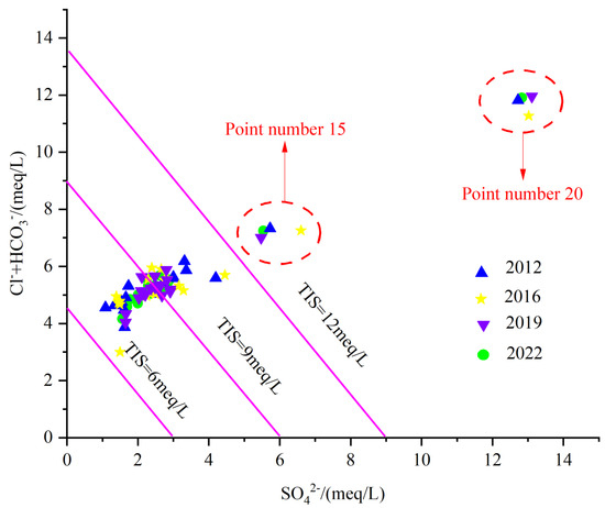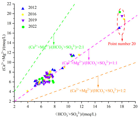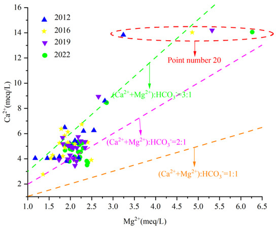 The analysis of the γCa2+/γMg2+ scatter diagram of karst groundwater in the Fengfeng mining area (Figure 12) shows that the milligram equivalent values of γCa2+ and γMg2+ in the eastern area with point number 20 are significantly higher than those in other areas, which is caused by poor runoff conditions and strong water–rock interaction. Most of the water sample points in the study area fall between the straight line 2:1 and 3:1 and keep approaching the straight line 2:1 during the ten years from 2012 to 2022, indicating that the dissolution of carbonate rock salt minerals mainly occurs in the karst groundwater in the study area, but the dissolution of dolomite continues to increase with the passage of time.