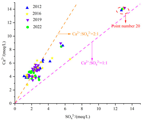 From Figure 14, it can be seen that most of the karst groundwater sample points are distributed near the straight line 2:1, while some water sample points are located near the straight line 1:1. None of the water sample points fall below the line 1:1, indicating that gypsum dissolution is indeed one of the main sources of SO42− in the groundwater of Fengfeng mining area. However, Ca2+ is affected not only by gypsum dissolution but also by other sources. Point 20 is located near the straight line 1:1, and the Ca2+ and SO42− milligram equivalent values are larger than those in other regions, indicating that the dissolution of evaporite is stronger in the eastern plain area with poor runoff conditions.