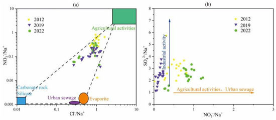 As can be seen from Figure 17, the karst groundwater in the study area has been affected by human activities. According to the relationship between the ratio of γCl−/γNa+ to γNO3−/γNa+ (Figure 17a), it can be seen that the influence of human factors has weakened from 2012 to 2022, indicating that the protection of groundwater resources in the study area has achieved certain results. The relationship between SO42−/Na+ and NO3−/Na+ ratios (Figure 17b) further shows that, over time, the effects of industrial activities weaken, while the effects of agricultural activities and municipal wastewater increase, but their effects are not very large. The effect of industrial activities is reduced, which proves that some areas of mine closure and regional governance have achieved some results.
