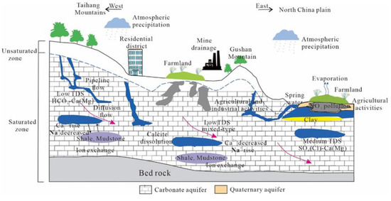 It can be seen from Figure 18 that from the Taihang Mountains in the west to the North China Plain in the east, the groundwater changes from the carbonate-exposed area to the alluvial proluvial fine soil plain area. The TDS of groundwater continuously increases from west to east, and its value gradually evolves from low salinity fresh water in the western mountainous areas to moderately mineralized brackish water in the eastern plain areas. Based on the geological and hydrogeological conditions of the study area, it can be seen that due to the steep terrain in the western mountainous areas, the groundwater runoff rate is faster and the leaching effect is stronger, so the HCO3-Ca(Mg) type water with low TDS is formed.