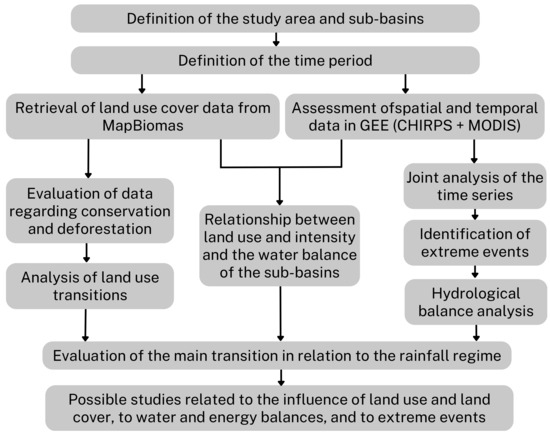 The relationship between land use and water balance was assessed by observing years of increased droughts and intense rains in connection with deforestation, considering the evolution of the forest formation area over the years. This methodology provided a more in-depth understanding of the relationship between land use and water balance, as well as the interpretation of climate patterns and the impacts of human activities in the Amazon Basin throughout the study period. Figure 1 presents the schematic flowchart of the methodology adopted for the present study.